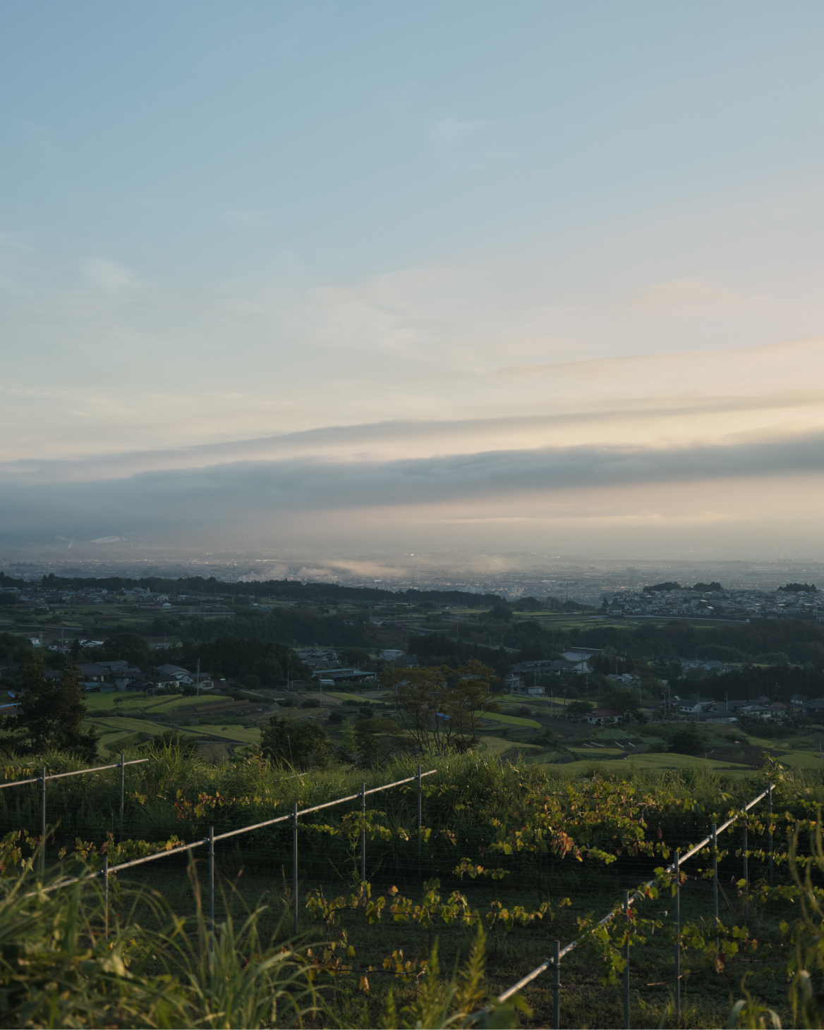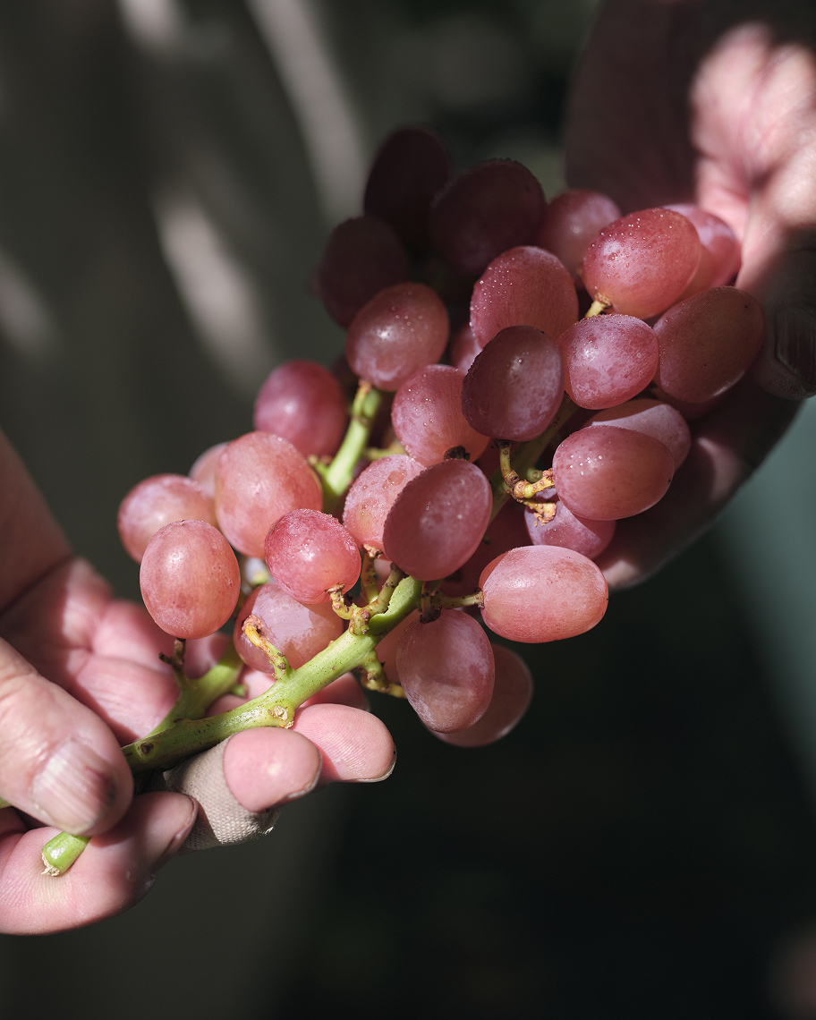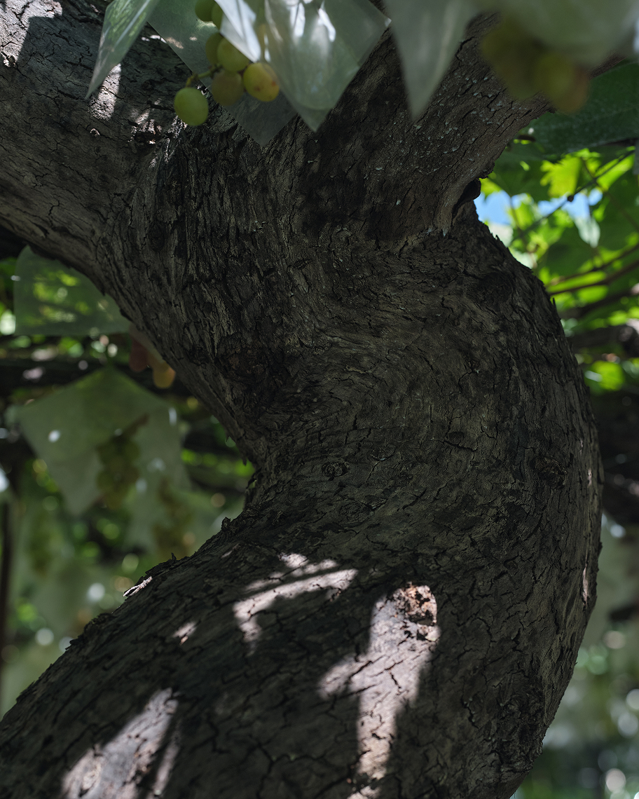 降り注ぐ太陽の照り返しを受けて、下から色づいていくブドウ。力強く根を張る幹から豊かに広がる葉を間引きし、“美しい木漏れ陽”をつくることで、甲斐路は次第に彩りを深めていきます。